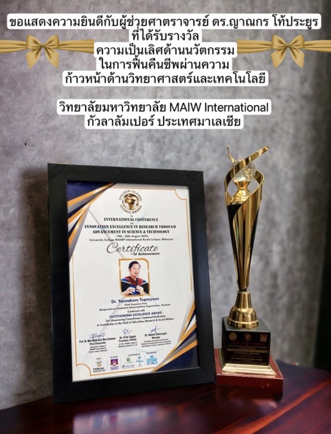ขอแสดงคามยินดีกับผู้ช่วยศาตราจารย์ ดร.ญาณกร โท้ประยูร ที่ได้รับรางวัลความเป็นเลิศด้านนวัตกรรม ในการฟื้นคืนชีพผ่านความก้าวหน้าด้านวิทยาศาสตร์และเทคโนโลยี วิทยาลัยมหาวิทยาลัย MAIW International กัวลาลัมเปอร์ ประเทศมาเลเชีย
